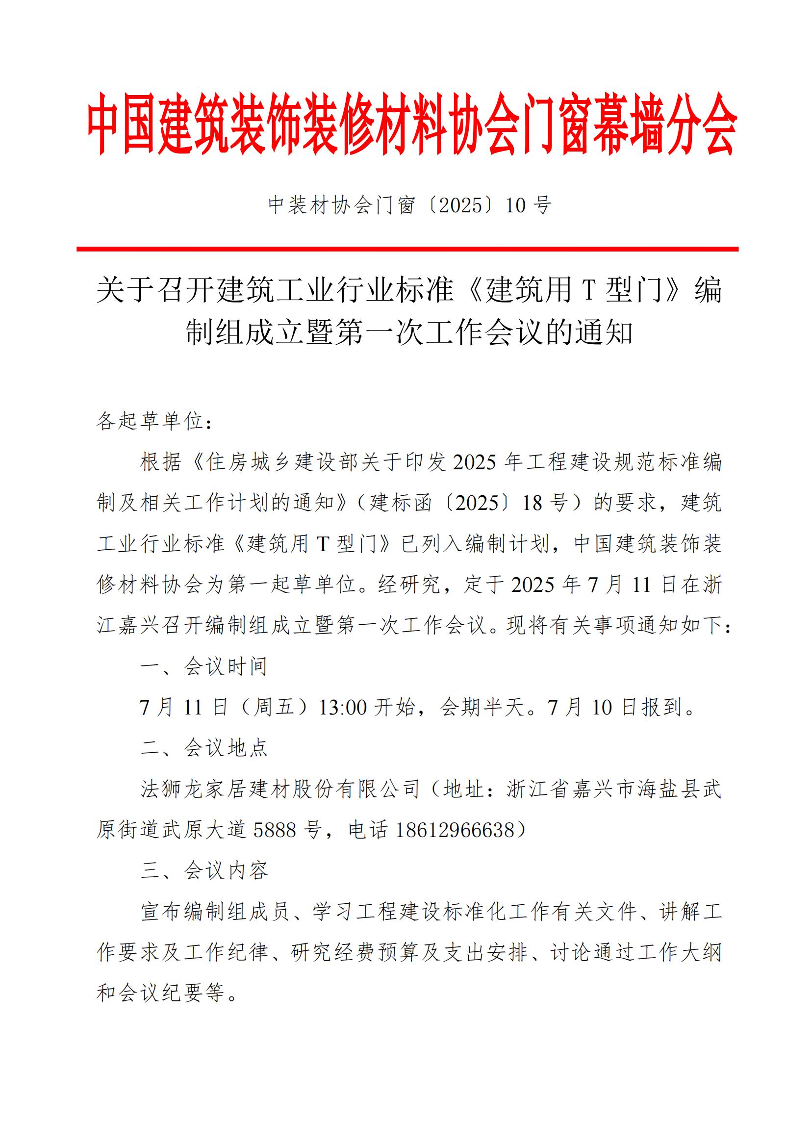 关于召开建筑工业行业标准《建筑用T型门》编制组成立暨第一次工作会议的通知