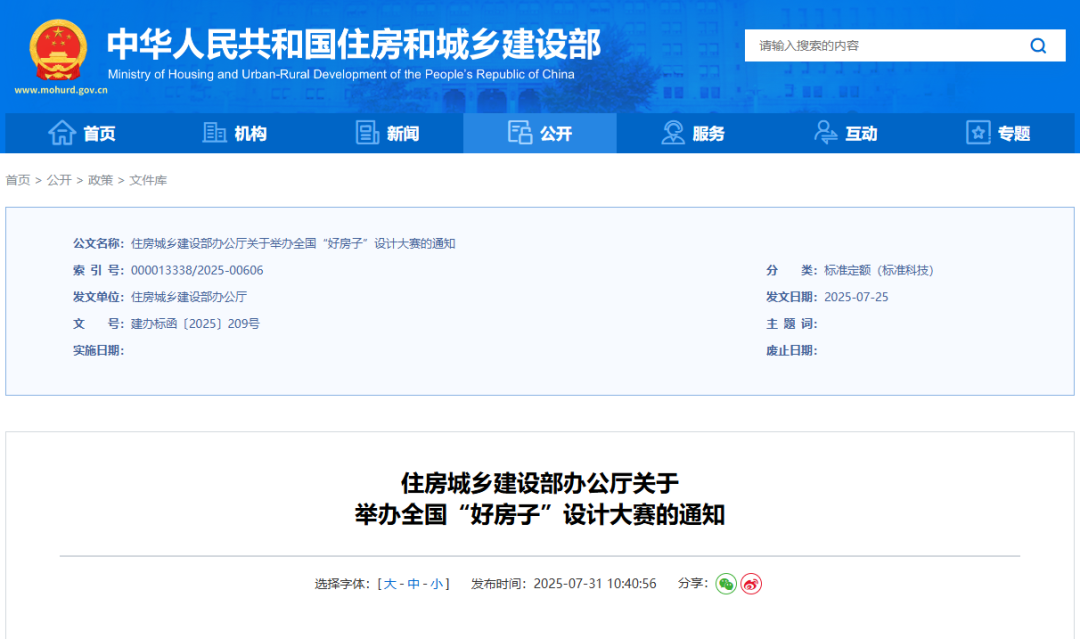 7月31日,中华人民共和国住房和城乡建设部发布《住房城乡建设部办公厅关于举办全国“好房子”设计大赛的通知》,原文内容如下: